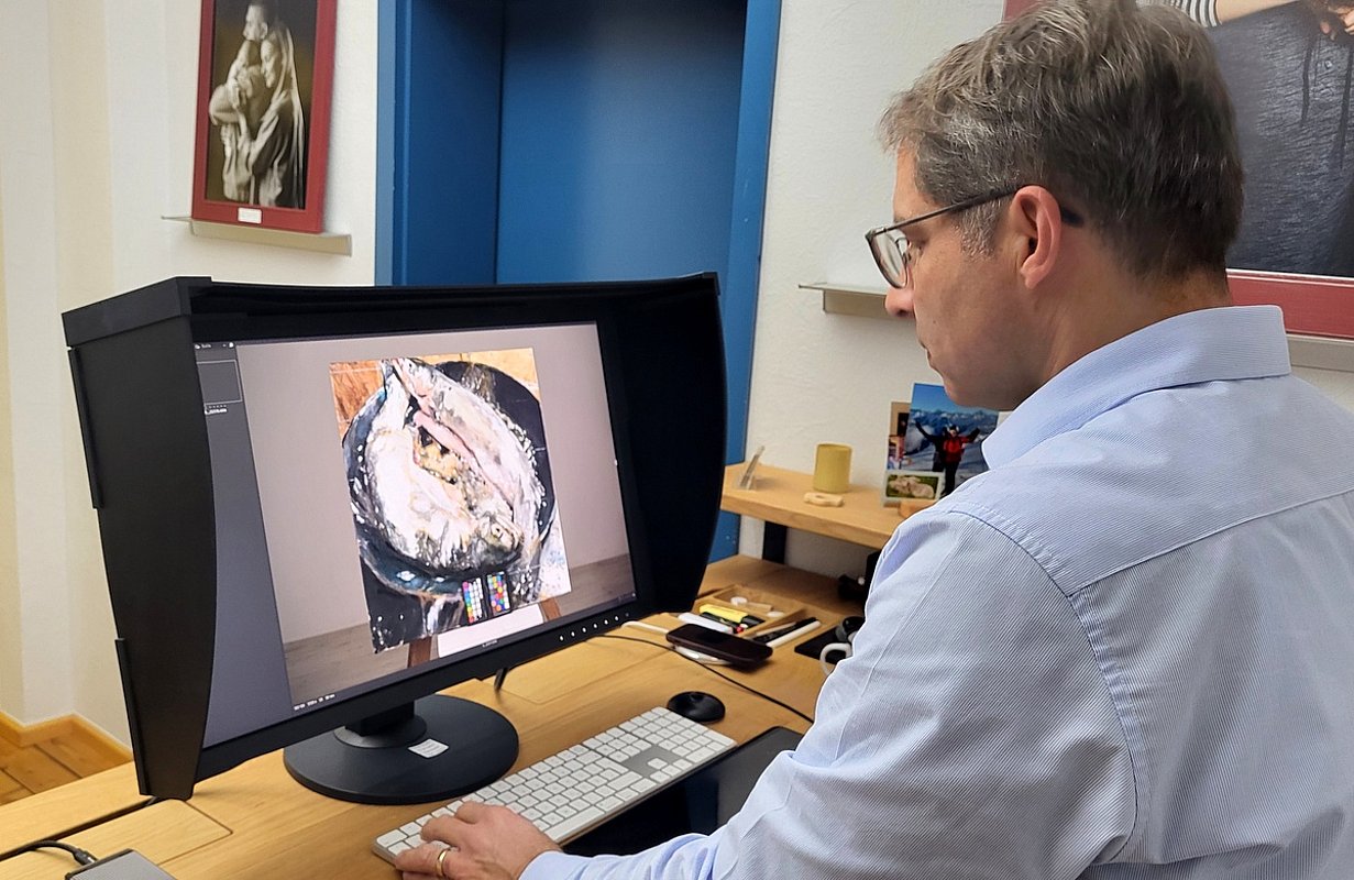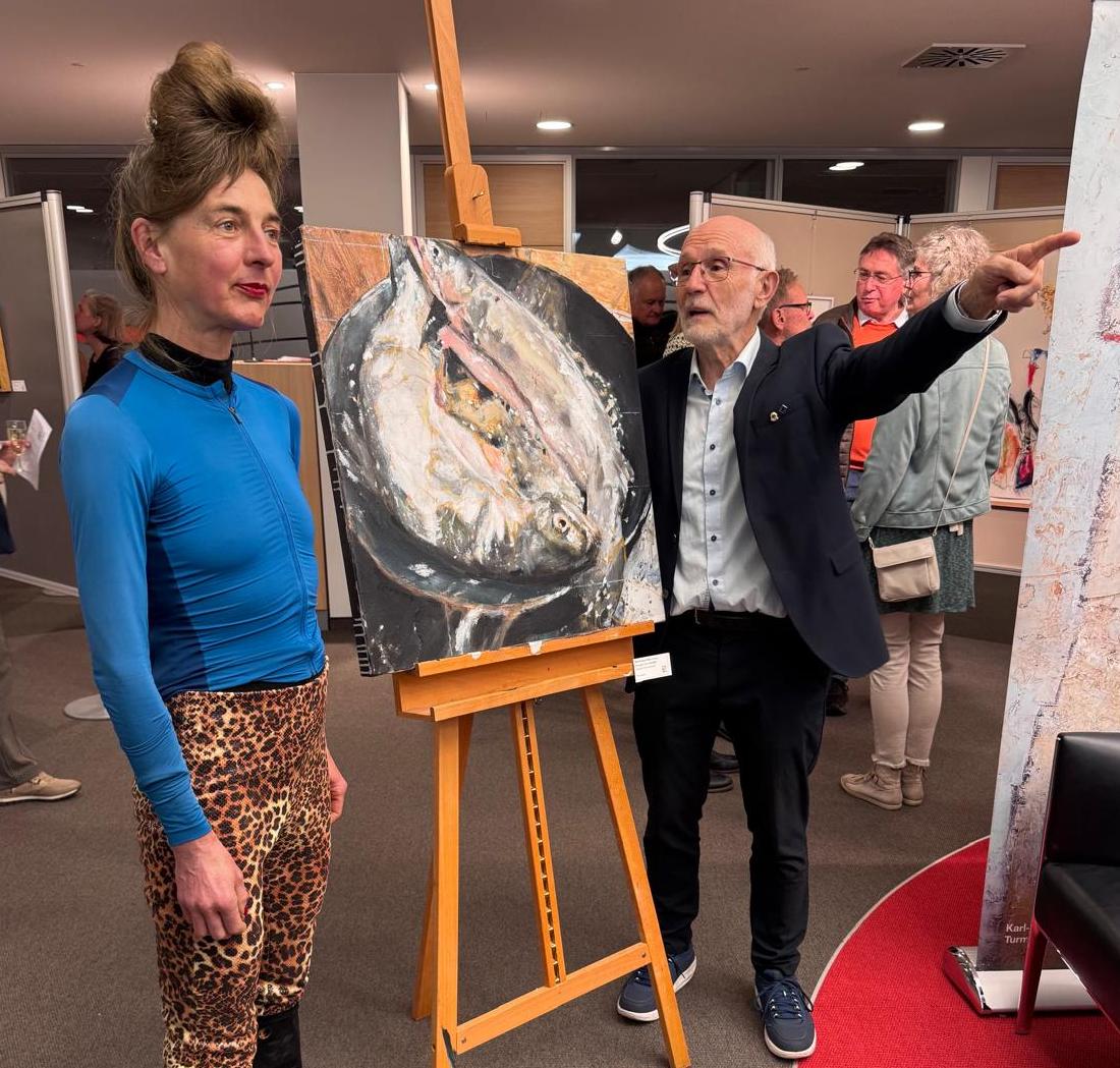 Für die Jahresgabe 2026 des Kulturkreises Daun hat Marion Anna Simon das quadratische Bild (Original 70 X 70 cm) „Forellen“ ausgewählt, ein Bild in Eitempera/öl auf Leinwand aus dem Jahr 2023. Es zeigt in einer Draufsicht zwei gebratene Forellen in einer schwarzen Gusseisenpfanne, als wolle man sie sogleich servieren.