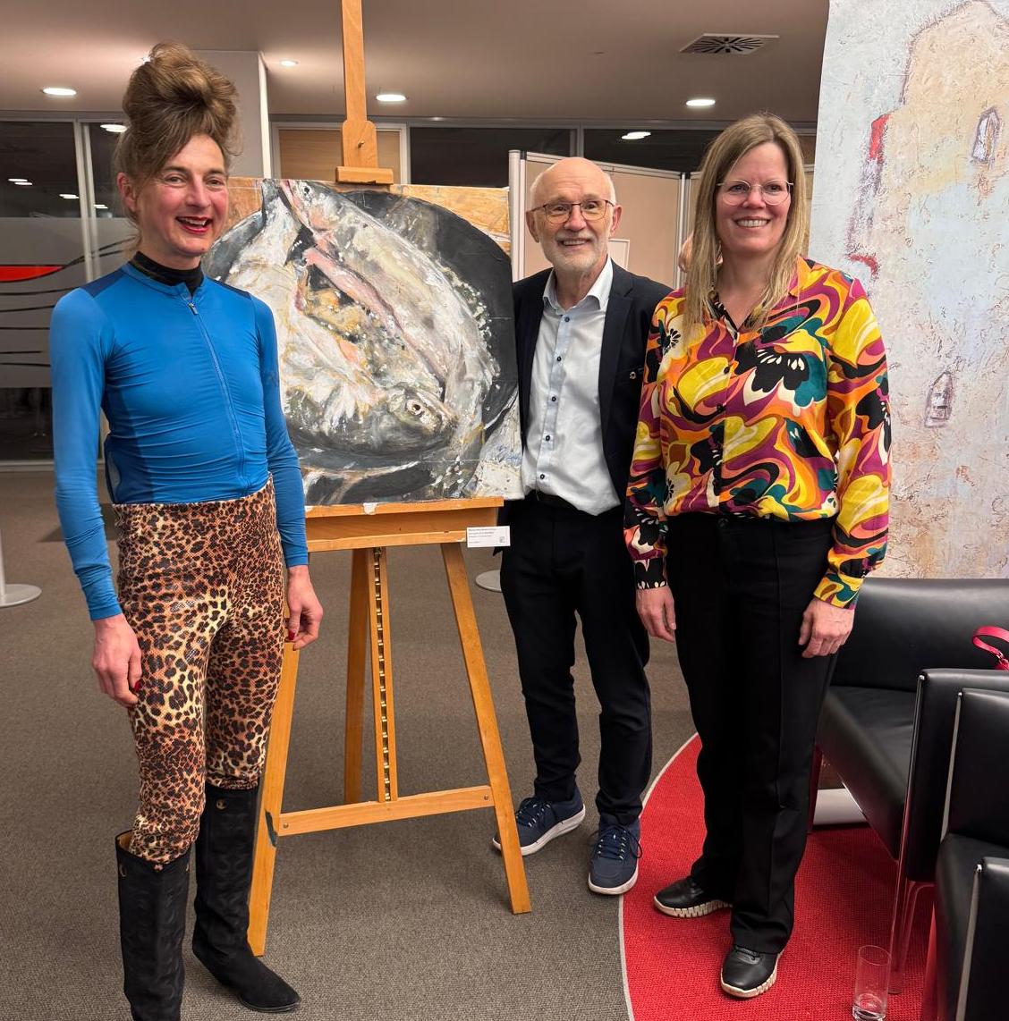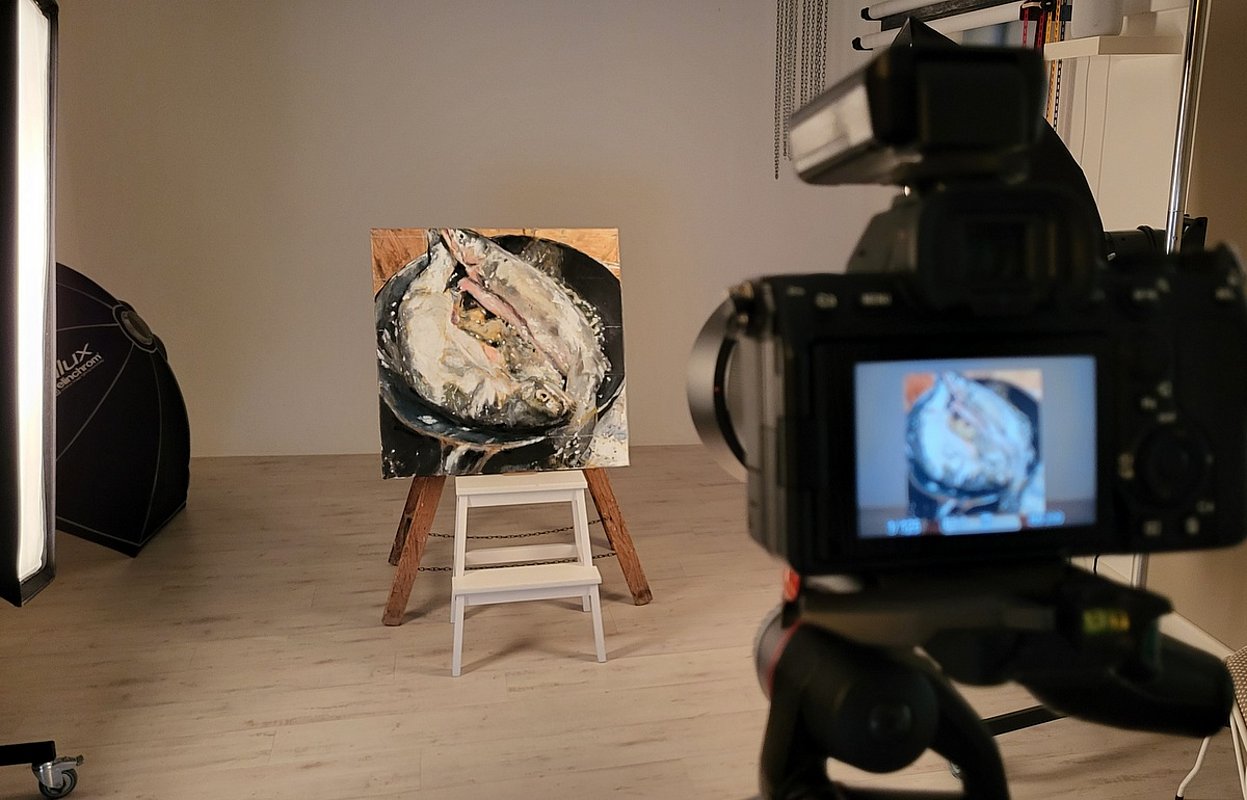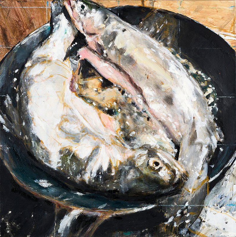 „Ich habe diese Forellen selbst zubereitet“, sagt die Künstlerin. „Ich male aus der Situation heraus. Ich versuche das auszudrücken, was ich beobachte, erlebe oder was mir Angst macht.“ Dabei steht bei ihr stets der Mensch im Mittelpunkt, auch wenn Dinge oder Situationen dargestellt sind - so Susanne Stumm in ihrem Bericht für den Trierischen Volksfreund.